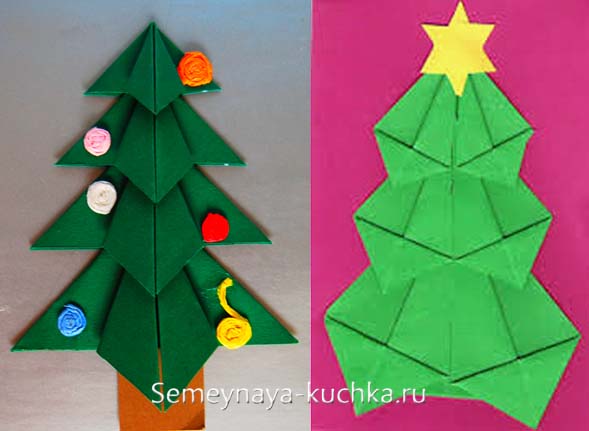 А вот аппликация новогодней елки в технике ОРИГАМИ (для детей 6-7 лет). Где из бумаги складываются модули – которые потом укладываются в образ елки. Как именно складывать модули для этой аппликации я подробно показала в статье, где мы клеяли похожие елочки на открытки — «Новогодние ОТКРЫТКИ — 82 идеи сделать своими руками».