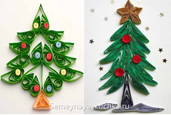 А вот идея аппликации новогодней елки в технике КВИЛЛИНГ. Здесь сложность заключается в том, что нужно самим заранее заготовить квиллинговые модули-закрутки.