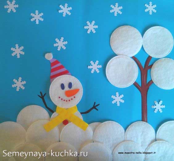 А вот серия аппликаций, где в качестве снежного материала используется белая мягкая вата. Вот пример где снеговик выполнен из ватных дисков, а снежная крона деревьев сделана из ватных шариков (отрываешь клочок ваты и скатываешь его руками в шарик – набираешь миску таких шариков и приступаешь к созданию новогодней аппликации.