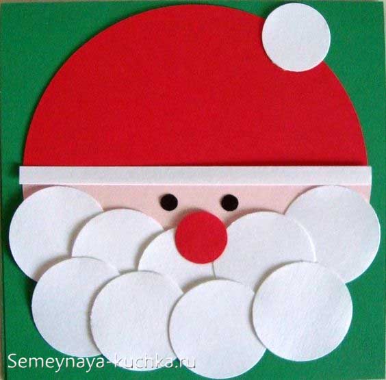 А вот аппликация Деда Мороза, где из ватных дисков сделана борода и помпон на шапке.