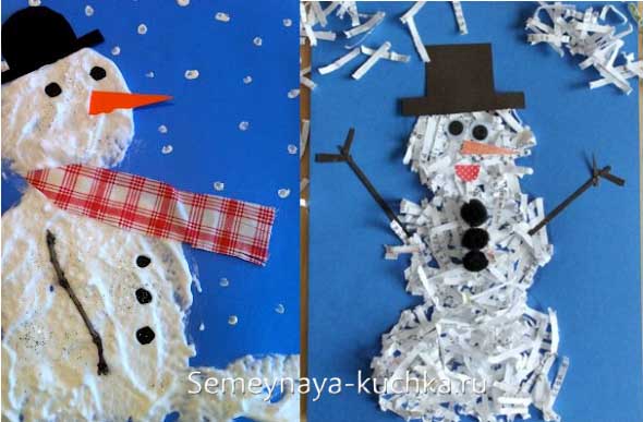 Самые простые аппликации для школы или детского сада – это снеговик. Но его не обязательно выполнять в традиционной технике. Можно проявить фантазию и сделать снеговика из нестандартных материалов – гипсовой штукатурки, разведенной в воде, или из мелко нарезанной мятой бумаги.