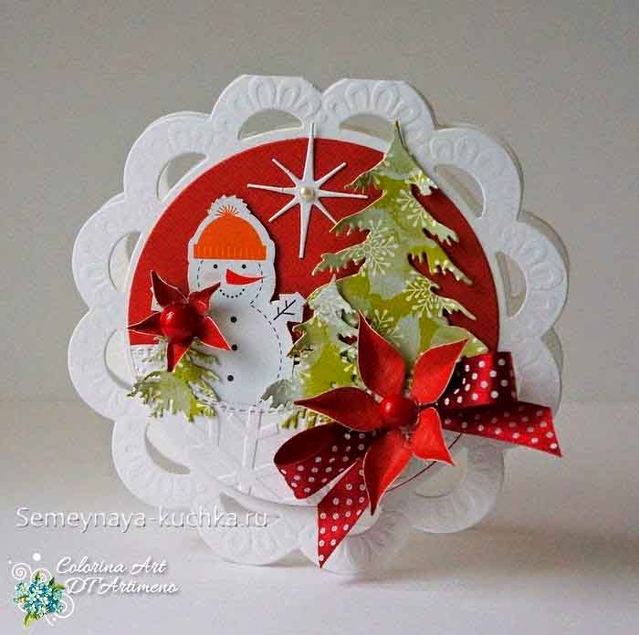 Детская новогодняя поделка-аппликация может быть многослойной. И ее не обязательно выполнять на прямоугольном листе бумаги. Наоборот детская поделка будет выглядеть наряднее если выполнить ее на круглом листе картона. А края листа обклеить бумажным кружевом, отрезанным от крупной бумажной снежинки.