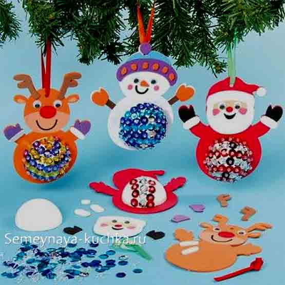 Можно сделать объемную аппликацию-подвеску на елку и в другой технике. Из картона и цветной бумаги формируем новогоднего персонажа. А потом к нему приклеиваем пузик, который в свою очередь декорируем стразами. Полукруглый животик-накрейку можно сделать разрезав пополам пенопластовый шар, или слепить из соленого теста, потом запечь или высужить.