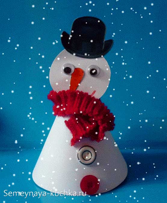 В таких поделках конус может быть лишь ТЕЛОМ будущего персонажа – а его ЛИЦО можно вставить в прорезь на верхушке конуса — как это сделано на новогодней поделке снеговике на фото ниже. Хорошая и простая поделка для занятий в детском саду (для средней и старшей группы — детей 4-6 лет).