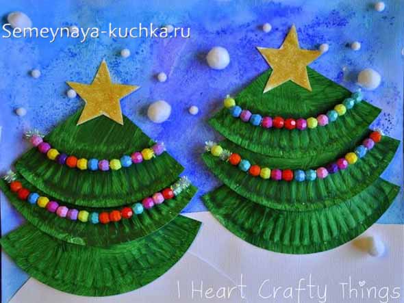 Разрежьте круг тарелки на четвертинки –и  вот они ненавязчиво сложились в елочку. Осталось взять зеленую краску и цветные бусы.