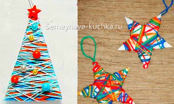 Чем ярче и сочнее цвет ниток – тем ярче и праздничнее будет ваша детская поделка. Яркие ленточки, клеевые стразы и вырезанные из плотной фольги звездочки только придадут поделке из ниток завершенность.