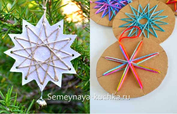 Можно нитки натягивать через отверстия (проколы дыроколом) – как на поделке снежинке с левого фото.