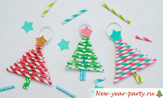 Самая простая поделка — елка из бумажных или пластиковых трубочек для напитков. Нужно только сложить их, обрезать и склеить, как на фото.