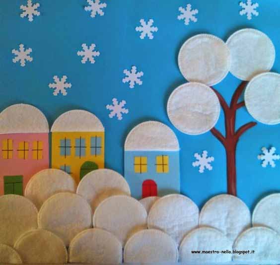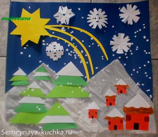 А вот идея как сделать далекий горный городок. Заснеженные горы изображаются при помощи белых бумажных салфеток. На склонах гор разбрасываем домики и елки, по небу рассыпаем снежинки-конфетти (их тоже можно надавить обычным офисным круглым дыроколом). И в небе добавляем рождественскую звезду с длинным шлейфом-хвостом из узких полосок бумаги. Красивая рождественская аппликация для детей на Новый Год.