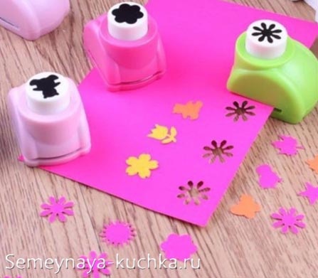 Снежинки на данной аппликации выполняются дыроколом с трафаретной нарезкой снежинок. Такие фигурные дыроколы продаются в магазинах поделок. А дешевле всего их заказать на сайте Али-Экспресс с бесплатной доставкой из Китая – одна штука получится за 0,5 доллара.