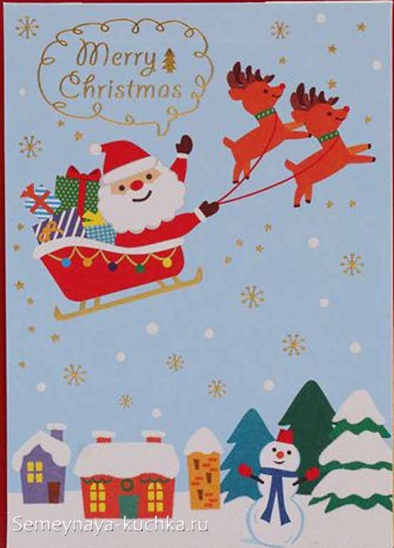 А еще над зимним городком можно наклеить аппликацию Деда Мороза, летящего на своих волшебных санях с оленями. Красивая волшебная аппликация на Новый Год.