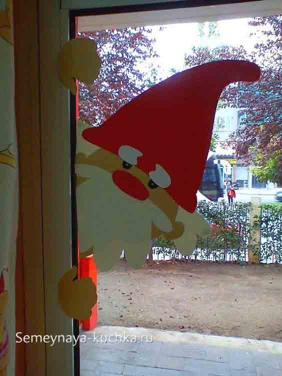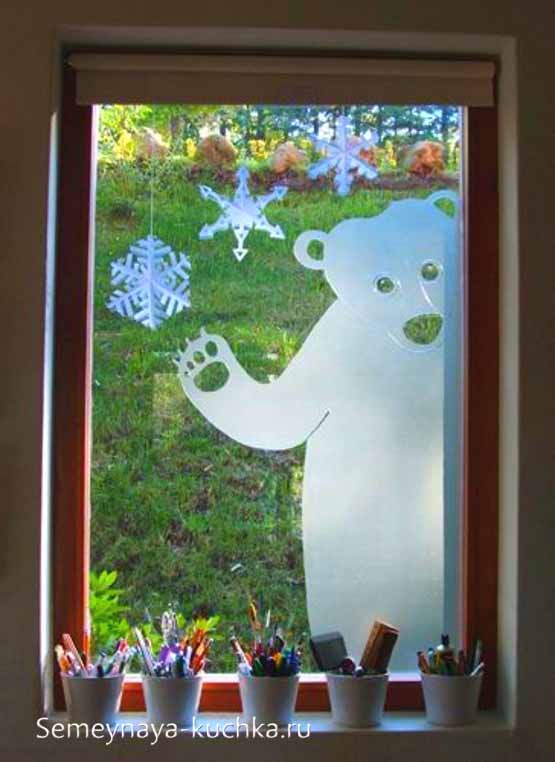 Например, сделать на стекле вот такого белого мишку или Деда Мороза, которые как будто заглядывают в наше окно. Красивая оконная аппликация в детский сад.