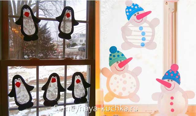 Или ваше окно может украсить аппликация дружных пингвинов или снеговиков в вязаных шапочках.
