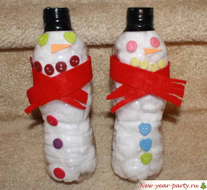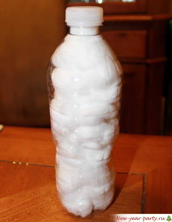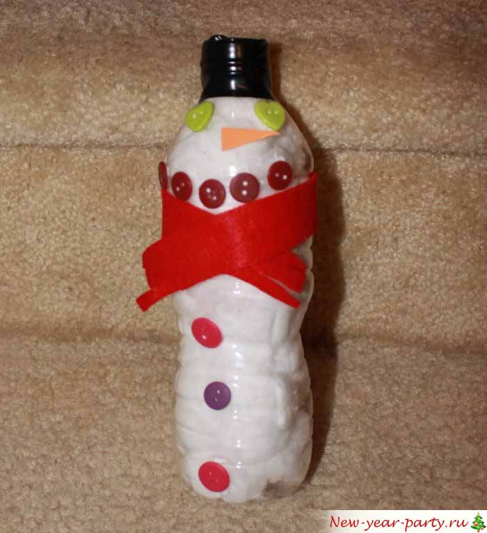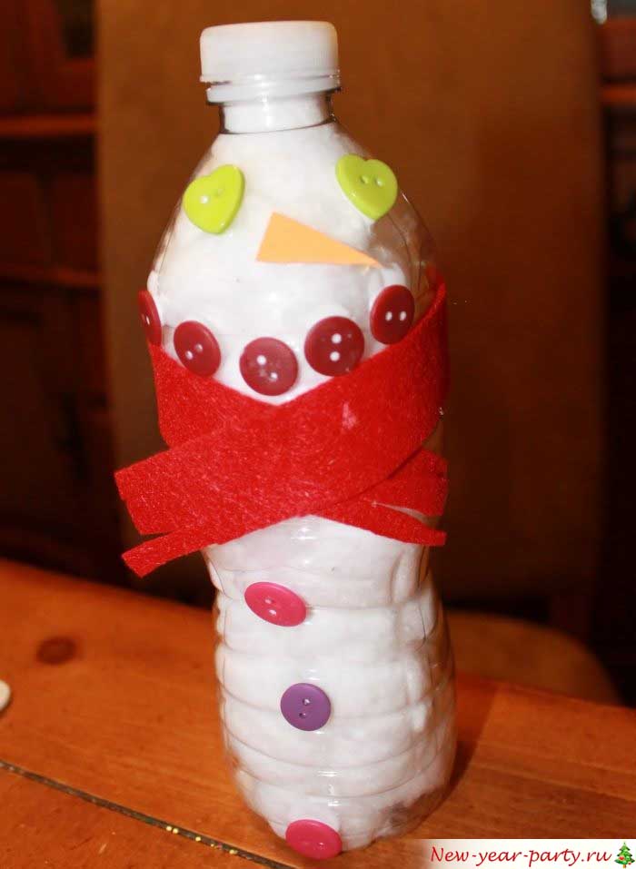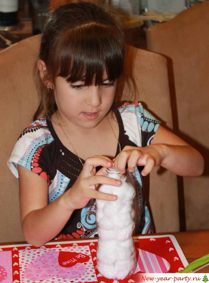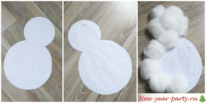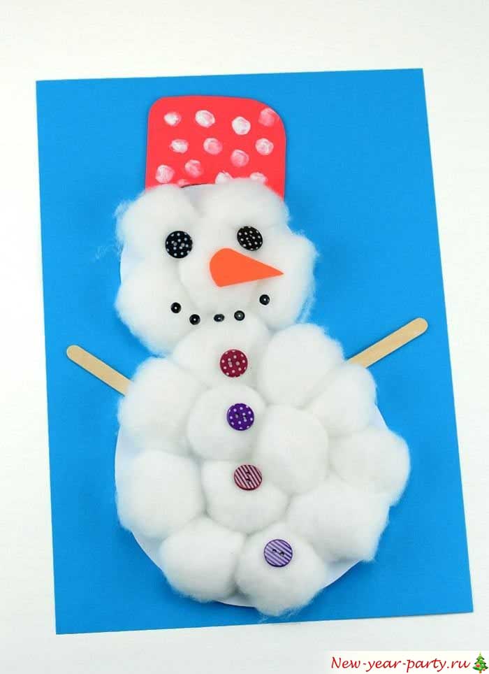 Бумажные круги разного размера и ватные спонжи позволят изготовить незатейливого снеговика — при желании и наличии оранжевой бумаги, он сможет обзавестись также носом — морковкой.