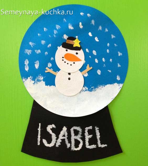 Даю только самую простую аппликацию снеговика для младшей группы детского сада – Снеговик внутри стеклянного снежного шара. Простая и очень красивая новогодняя аппликация.